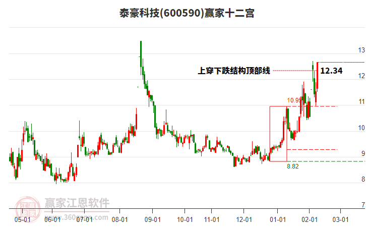 2月6日泰豪科技600590最高價11.89上穿了贏家極反通道工具藍色外軌線,受到藍色外軌線強力壓制,最終收盤停留在在藍色外軌線與生命線上方的強勢通道區(qū)域。泰豪科技600590近10個交易日漲幅2.7