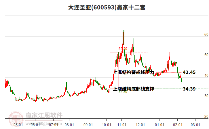 大連圣亞近期高點(diǎn)46.1持續(xù)下跌,漲幅回落13.32%,處于乾坤K線藍(lán)色下跌趨勢