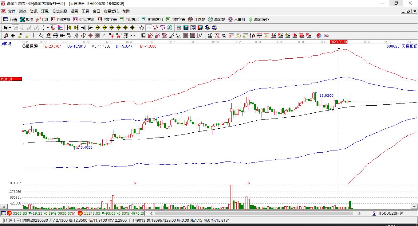 依據(jù)贏家江恩極反通道趨勢工具展示,本周股價(jià)處于生命線上強(qiáng)勢通道,本周收盤價(jià)6.85,自近期通道內(nèi)高點(diǎn)7.44持續(xù)下跌至本周,到達(dá)生命線5.915點(diǎn)上方,短期關(guān)注此線支撐,如支撐不破,保持在強(qiáng)勢通道內(nèi),波段繼續(xù)看多,有望再次挑戰(zhàn)藍(lán)色上軌線。若跌破生命線5.915,進(jìn)入弱勢通道,打開下跌空間。