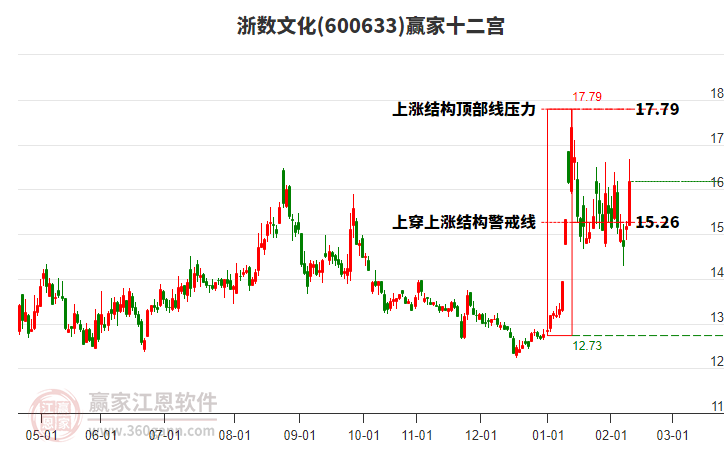 600633浙數(shù)文化根據(jù)贏家江恩極反通道趨勢工具展示,上方壓力位16.4174,下方支撐位14.0676。600633浙數(shù)文化處于贏家江恩多頭主線形態(tài),從2月6日形成底分型后持續(xù)上攻,今日突破前高形成