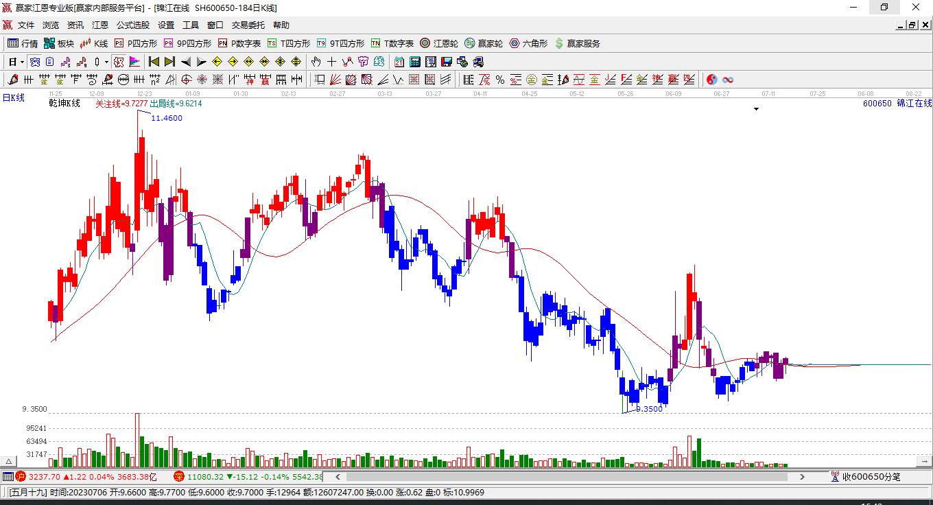 當(dāng)天錦江在線上穿藍(lán)色外軌線 以上影陽線收盤