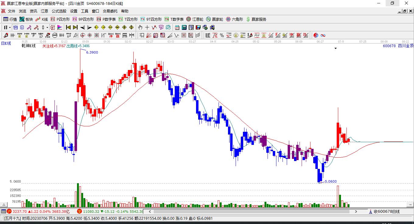 600678四川金頂上漲遇阻 受藍(lán)色外軌線壓制 以上影中陽線收盤