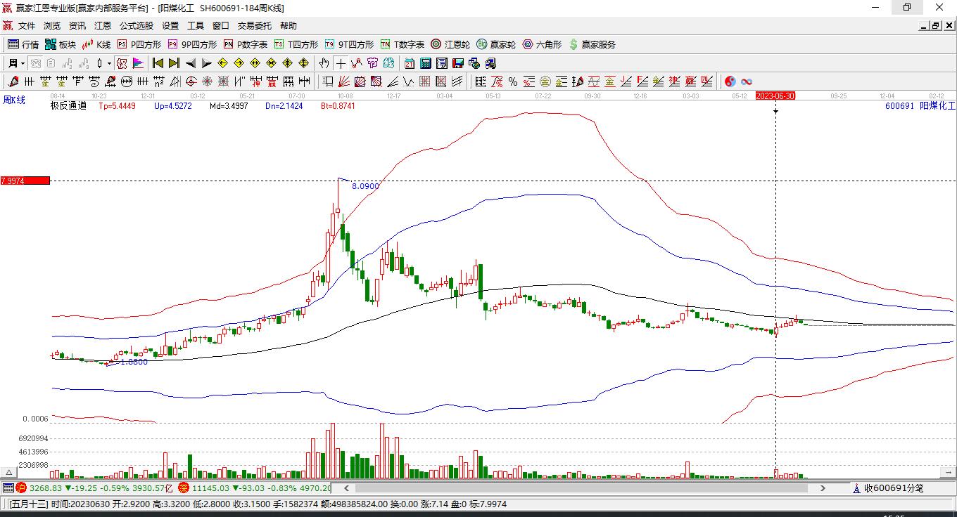 依據(jù)贏家江恩極反通道趨勢(shì)工具展示,本周股價(jià)處于生命線上強(qiáng)勢(shì)通道,本周收盤(pán)價(jià)3.06,自近期通道內(nèi)高點(diǎn)3.33持續(xù)下跌至本周,到達(dá)生命線2.5571點(diǎn)上方,短期關(guān)注此線支撐,如支撐不破,保持在強(qiáng)勢(shì)通道內(nèi),波段繼續(xù)看多,有望再次挑戰(zhàn)藍(lán)色上軌線。若跌破生命線2.5571,進(jìn)入弱勢(shì)通道,打開(kāi)下跌空間。