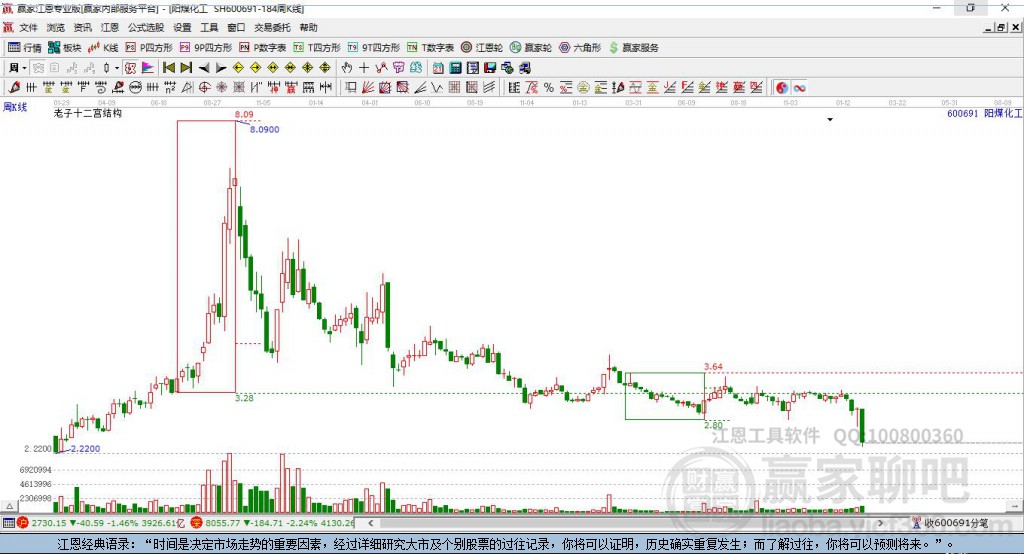 依據(jù)贏家十二宮結(jié)構(gòu)模型工具展示,本周股價(jià)處于2023年6月30日形成的下跌結(jié)構(gòu)底部線2.8上方區(qū)域,該股自近期高點(diǎn)3.33跌至本周3.06,跌幅8.82%。依據(jù)贏家十二宮多空能量守恒規(guī)則,若股價(jià)不能有效站穩(wěn)底部線,下方多空能量平衡位需結(jié)合前方贏家十二宮結(jié)構(gòu)尋找。
