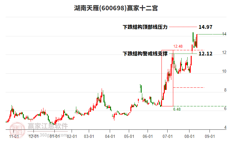 9月1日600698湖南天雁收盤價為12.65,小幅下跌2.99%,近期高點是14.9元,時間是2025年8月14日,到現在已經下跌12天,600698湖南天雁已經從14.9元回調了2.25元,幅度為