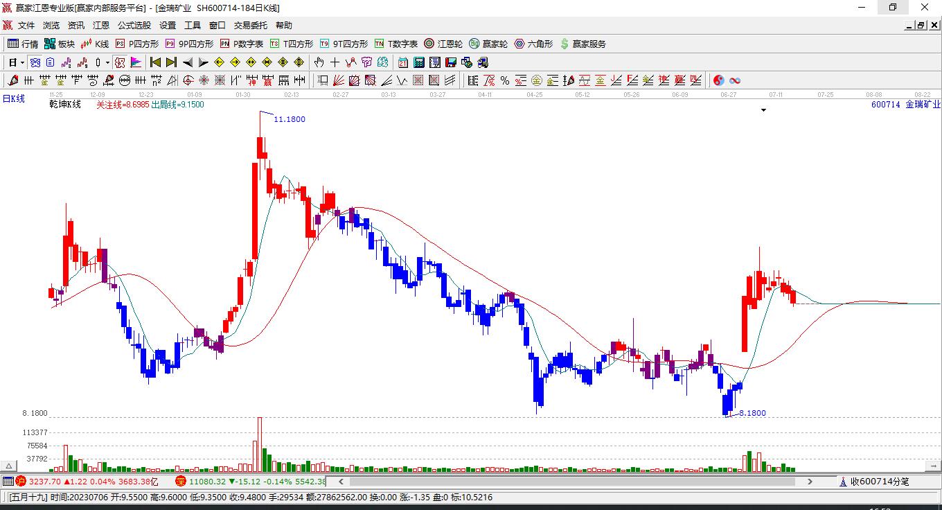 600714金瑞礦業(yè)上漲遇阻 受上方紅色外軌線壓制 以上下影中陽線收盤