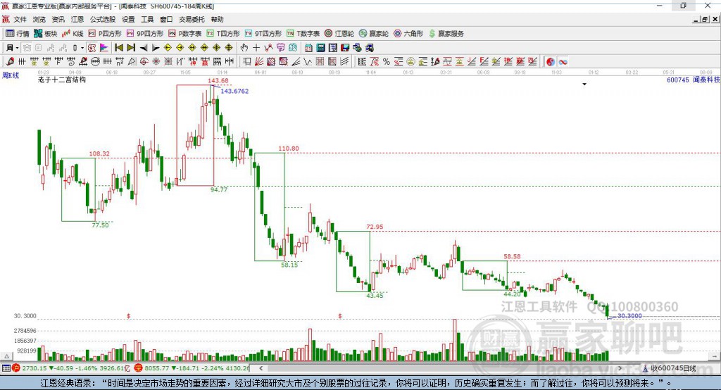 600745聞泰科技處于贏家江恩空頭主線形態(tài),今日重心下移,形成短期筑頂信號(hào),1月6日發(fā)出中期江恩筑底信號(hào)后,經(jīng)過27日,今日形成中期筑頂信號(hào),注意風(fēng)險(xiǎn)規(guī)避。600745聞泰科技根據(jù)贏家江恩極反通道趨