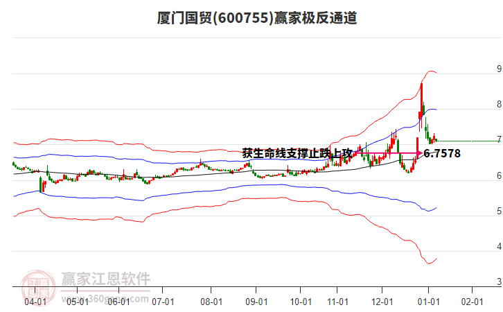 依據(jù)贏家江恩系統(tǒng)趨勢(shì)工具極反通道分析判斷廈門國(guó)貿(mào)600755運(yùn)行在生命線以下弱勢(shì)區(qū)域,根據(jù)規(guī)則該股短線輕倉(cāng)參與,股價(jià)跌至弱勢(shì)外軌線后波段再結(jié)合其它工具信號(hào)建倉(cāng)。應(yīng)用口訣是:生命線上強(qiáng)勢(shì)走,生命線下難抬頭;紅黃兩條外軌線,壓力支撐顯勢(shì)頭。