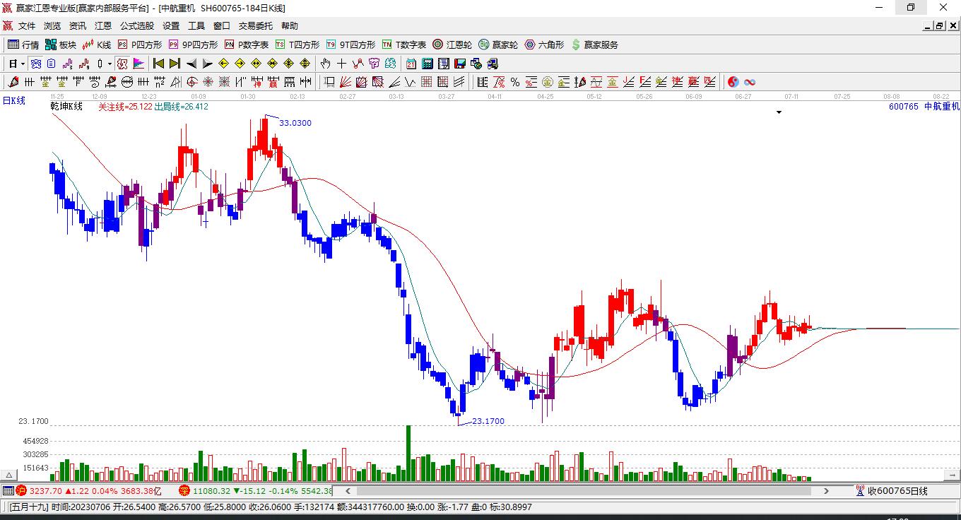 中航重機(jī)600765上漲遇阻 受藍(lán)色外軌線壓制 以穿頭破腳中陽線收盤