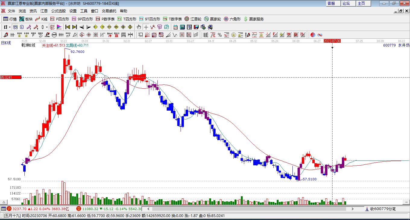 水井坊根據(jù)贏家江恩極反通道趨勢工具展示,上方壓力位39.277,下方支撐位34.0752。水井坊處于贏家江恩空頭主線形態(tài),從1月14日形成頂分型后持續(xù)下跌,今日形成短期初次筑頂信號,短期多頭趨勢已被破