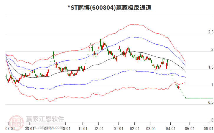 依據(jù)贏家江恩系統(tǒng)趨勢工具極反通道分析判斷*ST鵬博600804運行在生命線以下弱勢區(qū)域,根據(jù)規(guī)則該股短線輕倉參與,股價跌至弱勢外軌線后波段再結(jié)合其它工具信號建倉。應(yīng)用口訣是:生命線上強勢走,生命線下難抬頭;紅黃兩條外軌線,壓力支撐顯勢頭。