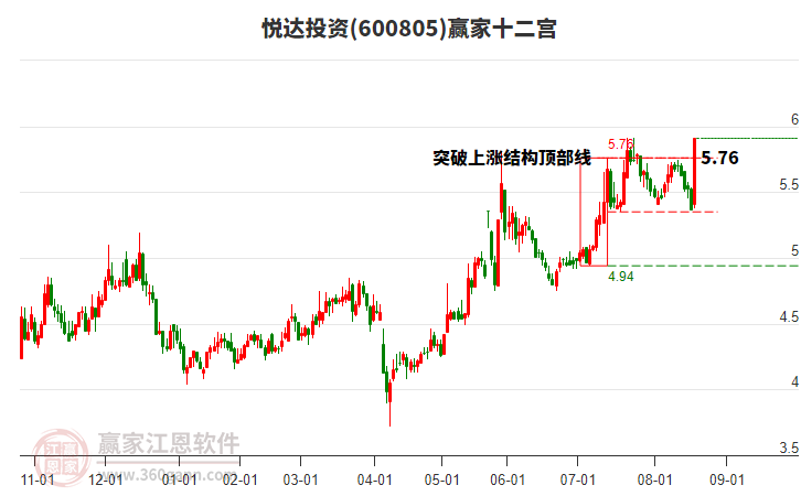 600805悅達(dá)投資根據(jù)贏家江恩極反通道趨勢工具展示,上方壓力位5.97,下方支撐位5.4538。600805悅達(dá)投資處于贏家江恩多頭主線形態(tài),今日重心上移,短期持續(xù)上漲,12月8日發(fā)出中期江恩筑頂信