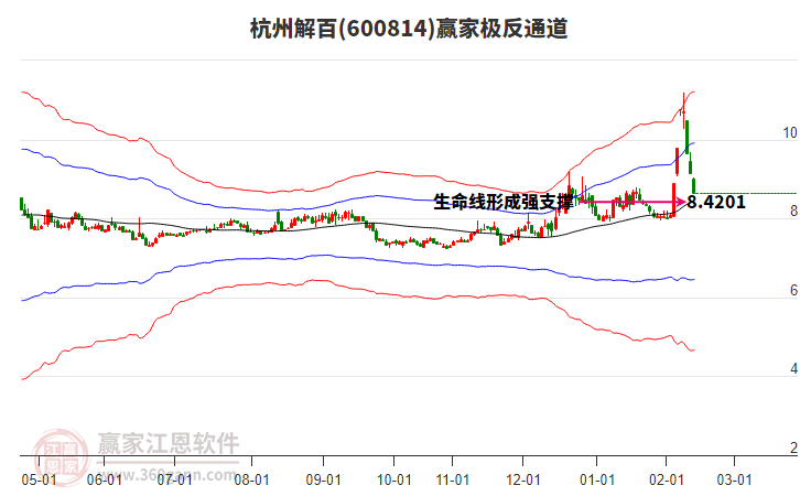 依據(jù)贏家江恩系統(tǒng)趨勢(shì)工具極反通道分析判斷杭州解百600814運(yùn)行在生命線以下弱勢(shì)區(qū)域,根據(jù)規(guī)則該股短線輕倉參與,股價(jià)跌至弱勢(shì)外軌線后波段再結(jié)合其它工具信號(hào)建倉。應(yīng)用口訣是:生命線上強(qiáng)勢(shì)走,生命線下難抬頭;紅黃兩條外軌線,壓力支撐顯勢(shì)頭。