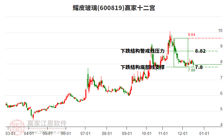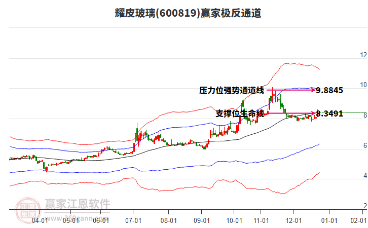 周二耀皮玻璃600819最高價(jià)9.64上穿了贏家極反通道工具藍(lán)色外軌線,受到藍(lán)色外軌線強(qiáng)力壓制,最終收盤停留在在藍(lán)色外軌線與生命線上方的強(qiáng)勢通道區(qū)域。耀皮玻璃600819近10個(gè)交易日漲幅11.0%。
