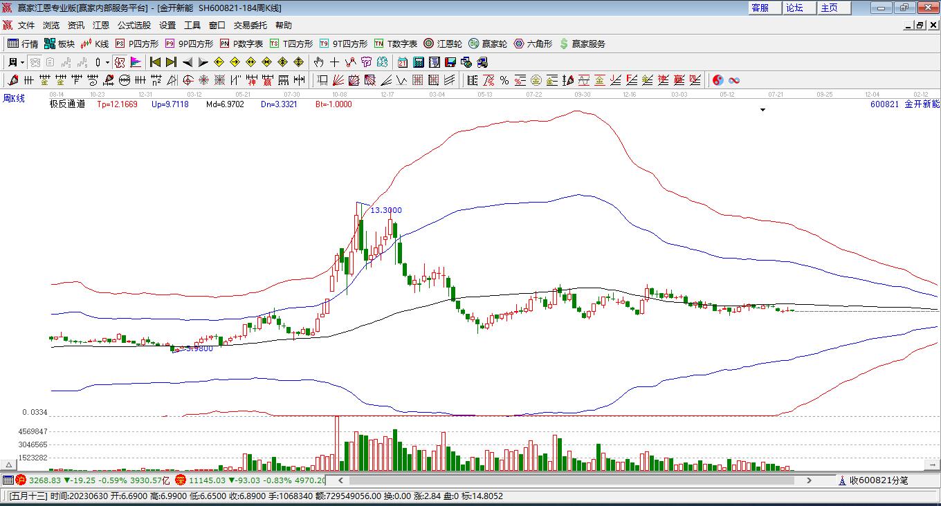 目前金開新能最高價6.2上穿了贏家極反通道工具上方紅色外軌線,受到上方紅色外軌線強力壓制,最終收盤停留在在上方紅色外軌線與藍色外軌線上方的超強通道區(qū)域。金開新能近10個交易日漲幅10.93%。
