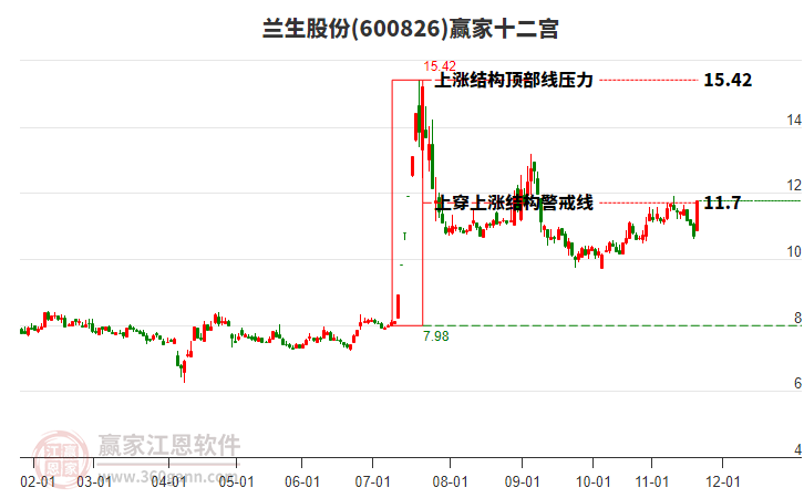 今天蘭生股份(600826)漲停,到達黃金價格分割工具壓力位11.69元下