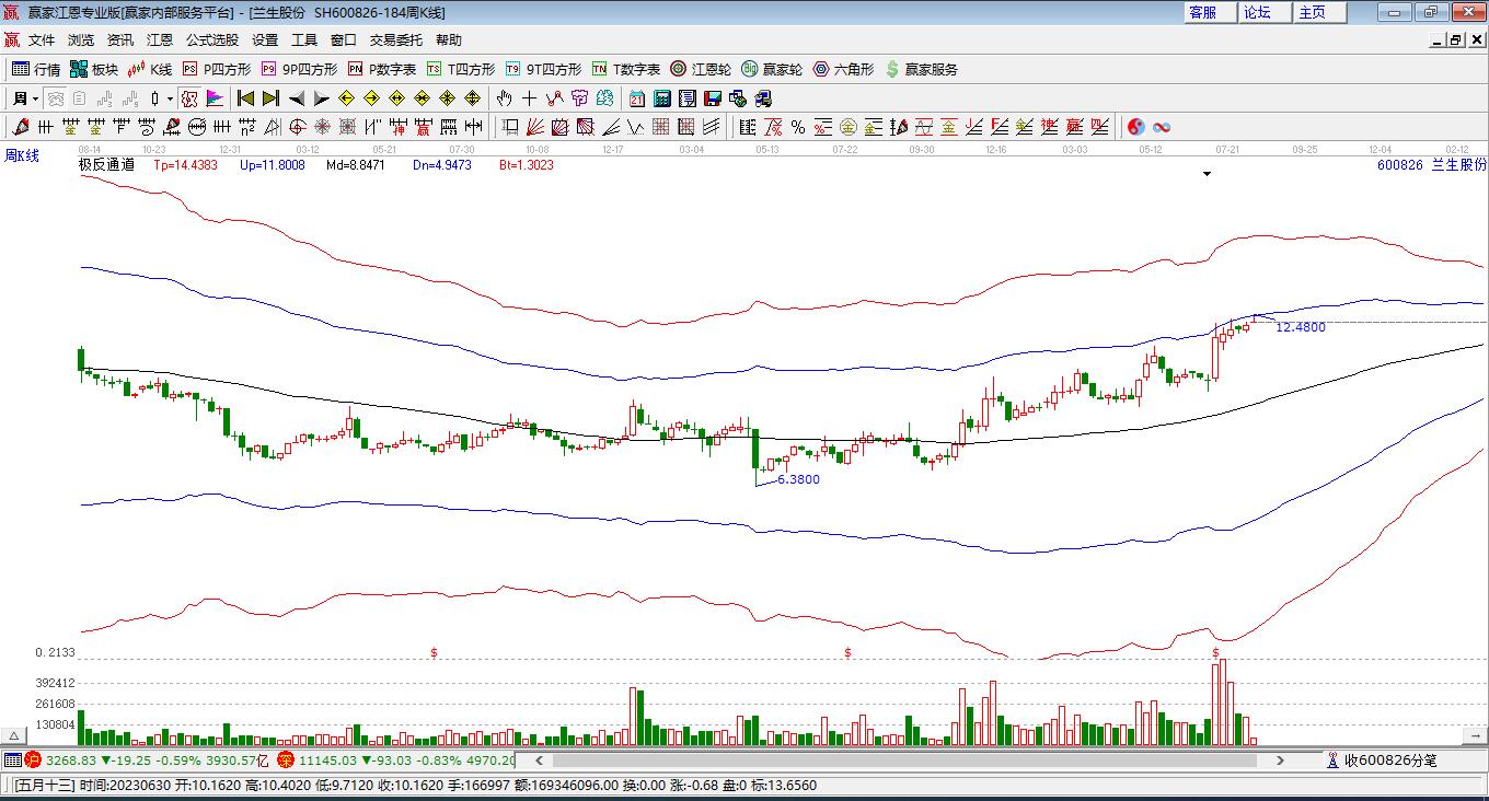 依據(jù)贏家江恩極反通道趨勢工具展示,本周股價處于生命線上強勢通道,本周收盤價12.16,自近期通道內(nèi)高點13.06持續(xù)下跌至本周,到達生命線9.78點上方,短期關(guān)注此線支撐,如支撐不破,保持在強勢通道內(nèi),波段繼續(xù)看多,有望再次挑戰(zhàn)藍色上軌線。若跌破生命線9.78,進入弱勢通道,打開下跌空間。