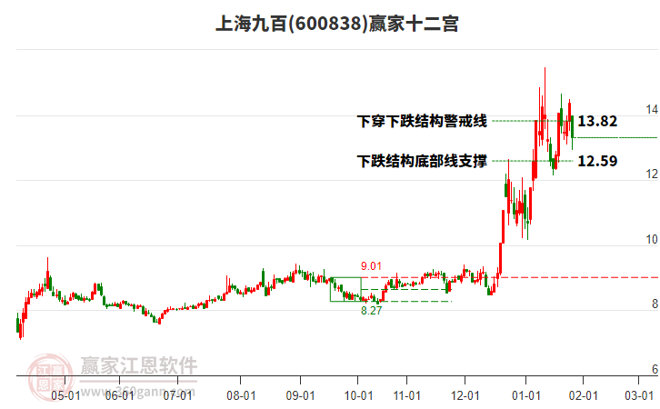 2月13日股價跌破上漲結(jié)構(gòu)頂部線位置,股價自前方高點(diǎn)2月5日13.1持續(xù)下跌6日跌幅17.81%,依據(jù)贏家十二宮結(jié)構(gòu)規(guī)則,股價突破上漲結(jié)構(gòu)頂部線后再次跌破頂部線,多空能量再次在頂部線尋找平衡。若確認(rèn)跌破頂部線,出現(xiàn)空方能量守恒狀態(tài),向下警戒線尋找多空能量平衡位。