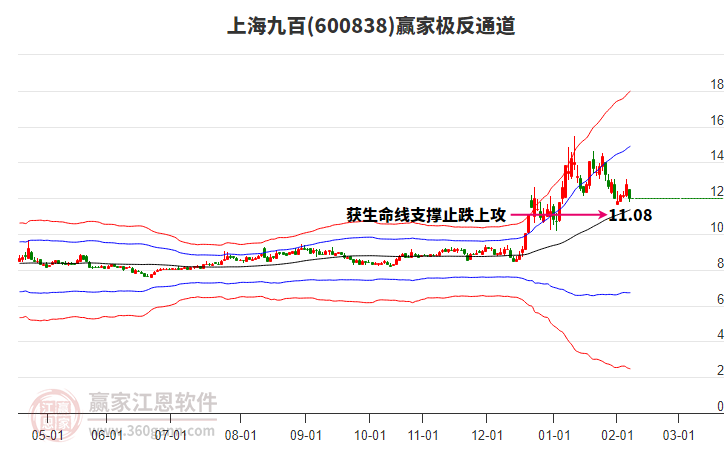 依據(jù)贏家江恩系統(tǒng)趨勢工具極反通道分析判斷上海九百600838運(yùn)行在生命線以下弱勢區(qū)域,根據(jù)規(guī)則該股短線輕倉參與,股價跌至弱勢外軌線后波段再結(jié)合其它工具信號建倉。應(yīng)用口訣是:生命線上強(qiáng)勢走,生命線下難抬頭;紅黃兩條外軌線,壓力支撐顯勢頭。