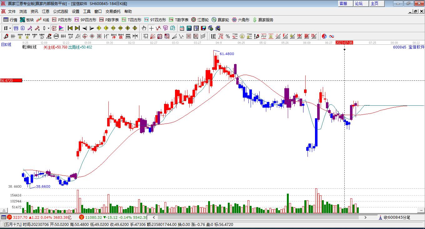 600845寶信軟件處于贏家江恩空頭中期反彈形態(tài),12月26日發(fā)出江恩筑底信號(hào)后,經(jīng)過32日,今日形成短期筑頂信號(hào),短期多頭趨勢(shì)已被破壞,中長(zhǎng)期多頭趨勢(shì)依舊保持。600845寶信軟件根據(jù)贏家江恩極反通
