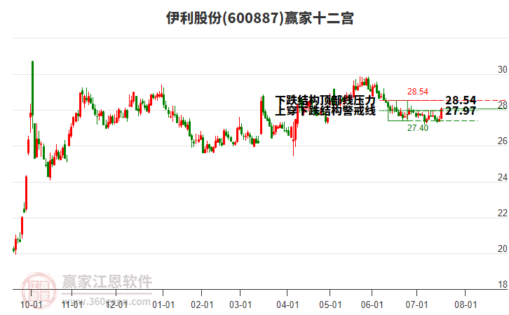 依據(jù)贏家江恩系統(tǒng)趨勢工具極反通道分析判斷伊利股份600887運(yùn)行在生命線以下弱勢區(qū)域,根據(jù)規(guī)則該股短線輕倉參與,股價(jià)跌至弱勢外軌線后波段再結(jié)合其它工具信號建倉。應(yīng)用口訣是:生命線上強(qiáng)勢走,生命線下難抬頭;紅黃兩條外軌線,壓力支撐顯勢頭。
