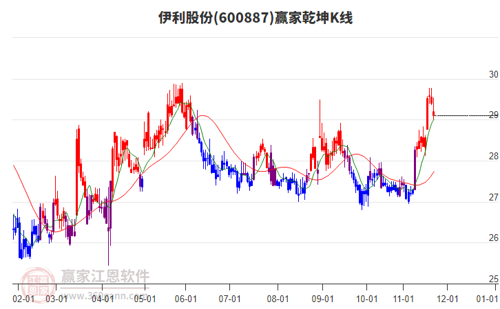 伊利股份(600887)處于贏家江恩多頭次主線形態(tài),11月10日發(fā)出江恩筑底信號后,經(jīng)過24日,今日形成短期筑頂信號,短期多頭趨勢已被破壞,中長期多頭趨勢依舊保持。伊利股份(600887)根據(jù)贏家江恩