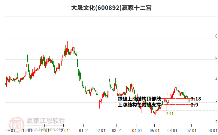 依據(jù)贏家江恩系統(tǒng)趨勢工具極反通道分析判斷大晟文化600892運行在生命線以下弱勢區(qū)域,根據(jù)規(guī)則該股短線輕倉參與,股價跌至弱勢外軌線后波段再結(jié)合其它工具信號建倉。應(yīng)用口訣是:生命線上強勢走,生命線下難抬頭;紅黃兩條外軌線,壓力支撐顯勢頭。