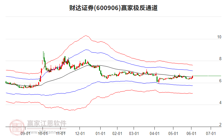 依據(jù)贏家江恩系統(tǒng)趨勢工具極反通道分析判斷財達證券600906運行在生命線以下弱勢區(qū)域,根據(jù)規(guī)則該股短線輕倉參與,股價跌至弱勢外軌線后波段再結(jié)合其它工具信號建倉。應用口訣是:生命線上強勢走,生命線下難抬頭;紅黃兩條外軌線,壓力支撐顯勢頭。