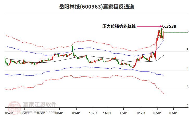今天岳陽林紙600963最高價6.18上穿了贏家極反通道工具上方紅色外軌線,受到上方紅色外軌線強力壓制,最終收盤停留在在上方紅色外軌線與藍色外軌線上方的超強通道區(qū)域。岳陽林紙600963近10個交易日