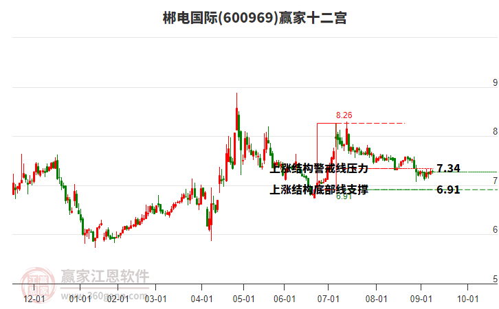 郴電國際處于贏家江恩多頭次主線形態(tài),12月31日發(fā)出江恩筑底信號后,經(jīng)過33日,今日形成短期筑頂信號,短期多頭趨勢已被破壞,中長期多頭趨勢依舊保持。郴電國際根據(jù)贏家江恩極反通道趨勢工具展示,上方壓力位