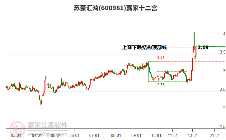 蘇豪匯鴻處于贏家江恩多頭次主線形態(tài),12月1日發(fā)出江恩筑底信號后,經(jīng)過71日,今日形成短期筑頂信號,短期多頭趨勢已被破壞,中長期多頭趨勢依舊保持。蘇豪匯鴻根據(jù)贏家江恩極反通道趨勢工具展示,上方壓力位3