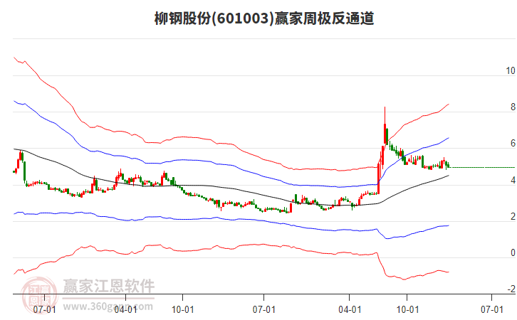 依據(jù)贏家江恩極反通道趨勢工具展示,本周股價(jià)處于生命線上強(qiáng)勢通道,本周收盤價(jià)4.98,自近期通道內(nèi)低點(diǎn)4.81上漲至本周,到達(dá)生命線4.5035點(diǎn)上方,短期關(guān)注此線支撐,如支撐不破,保持在強(qiáng)勢通道內(nèi),波段繼續(xù)看多,有望挑戰(zhàn)藍(lán)色上軌線。若跌破生命線4.5035,進(jìn)入弱勢通道,調(diào)整周期繼續(xù)延長。