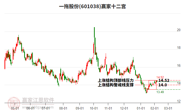 依據(jù)贏家江恩輪中輪價(jià)格模型工具展示,2月13日股價(jià)微漲0.28%,自近期低點(diǎn)2月6日13.6,至今漲幅為4.85%,今天突破了贏家江恩輪中輪三角形14.24重要位置。依據(jù)贏家江恩輪中輪規(guī)則,市場(chǎng)中圓形、三角形、四方形是一切市場(chǎng)周期運(yùn)行的基礎(chǔ)。若價(jià)格能站穩(wěn)三角形關(guān)鍵位置,則向上關(guān)注四方形壓力位14.33。若再次跌破三角形關(guān)鍵位置,將注意下方四方形關(guān)鍵支撐位14.08。