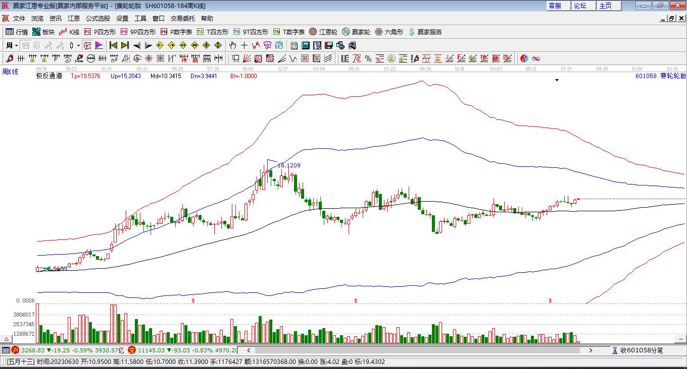 當天601058賽輪輪胎最高價16.55上穿了贏家極反通道工具生命線,受到生命線強力壓制,最終收盤停留在在生命線與藍色下軌線上方的弱勢通道區(qū)域。601058賽輪輪胎近10個交易日漲幅5.78%。
