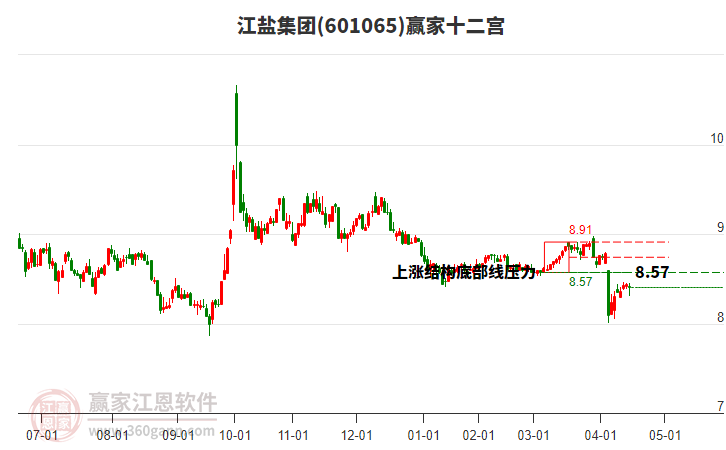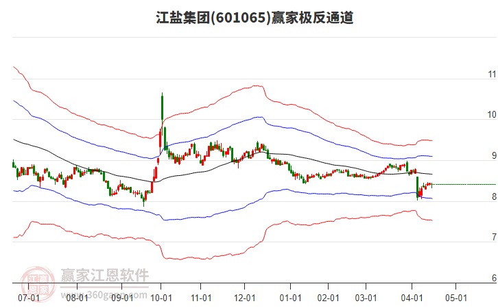 依據(jù)贏家江恩系統(tǒng)趨勢工具極反通道分析判斷江鹽集團601065運行在生命線以下弱勢區(qū)域,根據(jù)規(guī)則該股短線輕倉參與,股價跌至弱勢外軌線后波段再結(jié)合其它工具信號建倉。應(yīng)用口訣是:生命線上強勢走,生命線下難抬頭;紅黃兩條外軌線,壓力支撐顯勢頭。