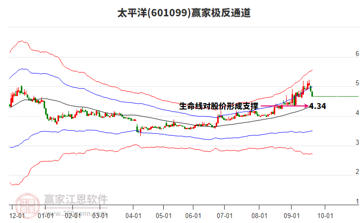 依據贏家江恩系統(tǒng)趨勢工具極反通道分析判斷太平洋601099運行在生命線以下弱勢區(qū)域,根據規(guī)則該股短線輕倉參與,股價跌至弱勢外軌線后波段再結合其它工具信號建倉。應用口訣是:生命線上強勢走,生命線下難抬頭;紅黃兩條外軌線,壓力支撐顯勢頭。