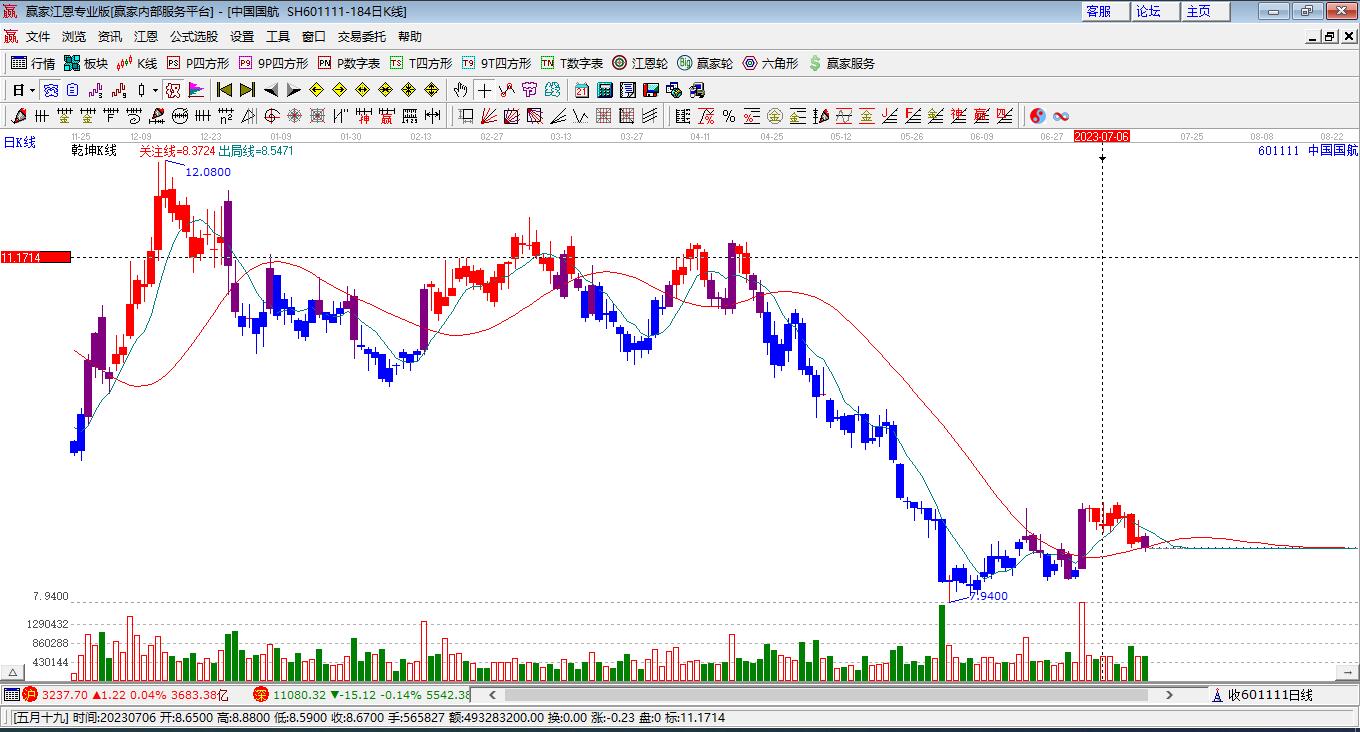 中國國航(601111)低開收穿頭破腳大陽線,目前處于多頭趨勢