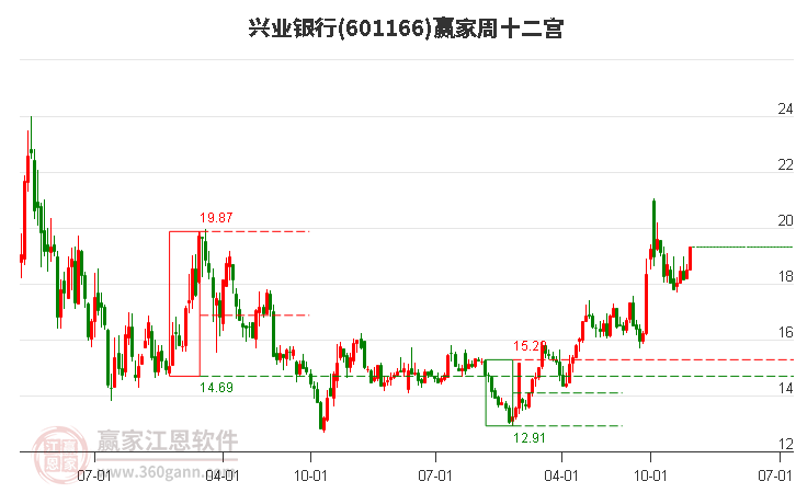 興業(yè)銀行在高點21.58后,回調(diào)了2.46元,跌破贏家十二宮下跌結(jié)構(gòu)底部線