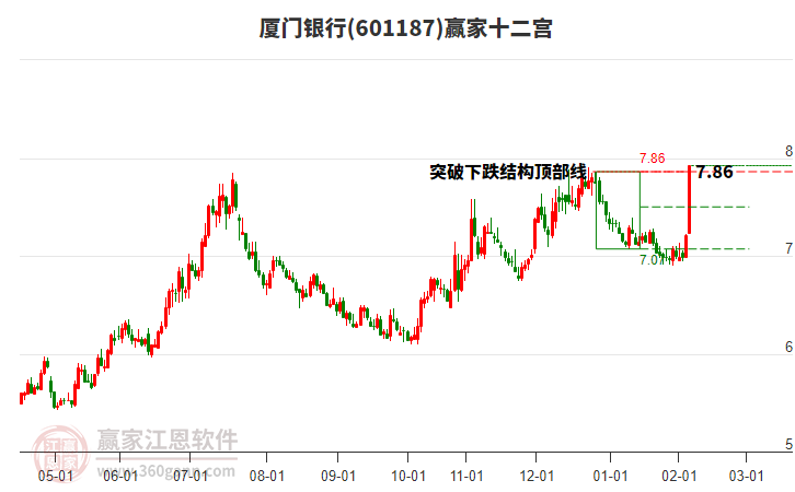 601187廈門銀行今天,以漲停收盤,近15日漲幅10.91%,今日K線上穿前方下跌結(jié)構(gòu)頂部紅色阻力線