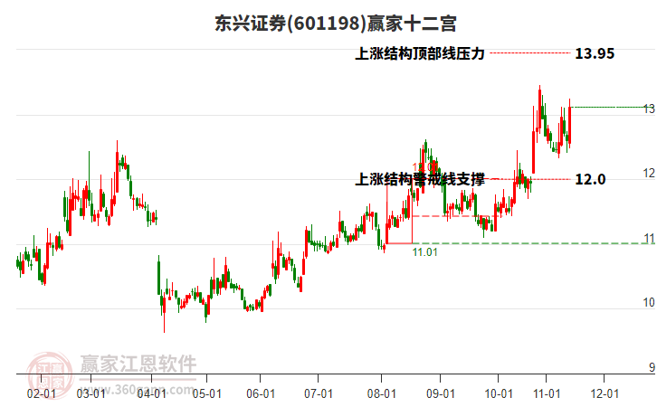 目前601198東興證券最高價(jià)13.6挑戰(zhàn)了贏家極反通道工具藍(lán)色外軌線,受到藍(lán)色外軌線強(qiáng)力壓制,最終收盤停留在在藍(lán)色外軌線與生命線上方的強(qiáng)勢通道區(qū)域。601198東興證券近10個(gè)交易日漲幅5.55%。
