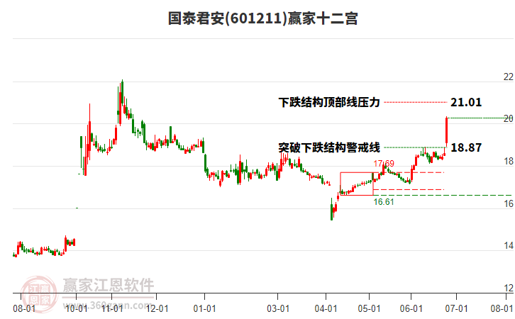 601211國泰海通處于贏家江恩多頭次主線形態(tài),從1月7日形成頂分型后持續(xù)下跌,重心下移,今日跌破前低形成短期初次筑頂信號,短期多頭趨勢已被破壞,中期雖然處于回調中,但長期多頭趨勢延續(xù)。601211國
