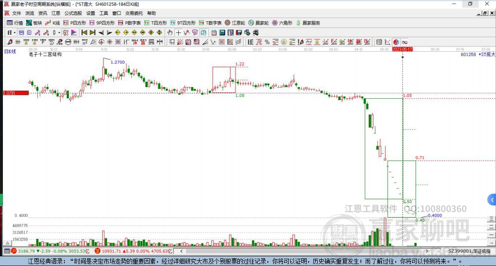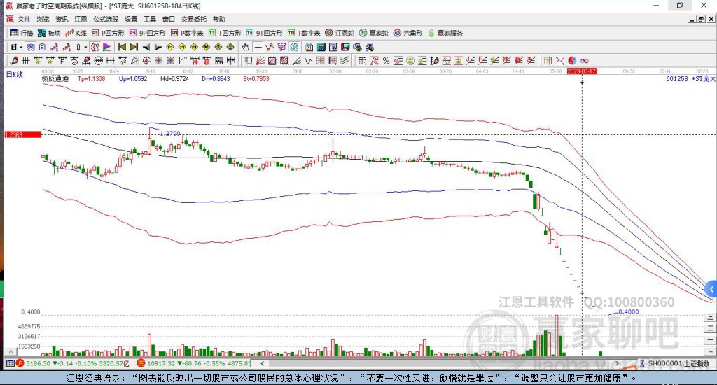 依據(jù)贏家江恩系統(tǒng)趨勢(shì)工具極反通道分析判斷*ST龐大601258運(yùn)行在生命線(xiàn)以下弱勢(shì)區(qū)域,根據(jù)規(guī)則該股短線(xiàn)輕倉(cāng)參與,股價(jià)跌至弱勢(shì)外軌線(xiàn)后波段再結(jié)合其它工具信號(hào)建倉(cāng)。應(yīng)用口訣是:生命線(xiàn)上強(qiáng)勢(shì)走,生命線(xiàn)下難抬頭;紅黃兩條外軌線(xiàn),壓力支撐顯勢(shì)頭。