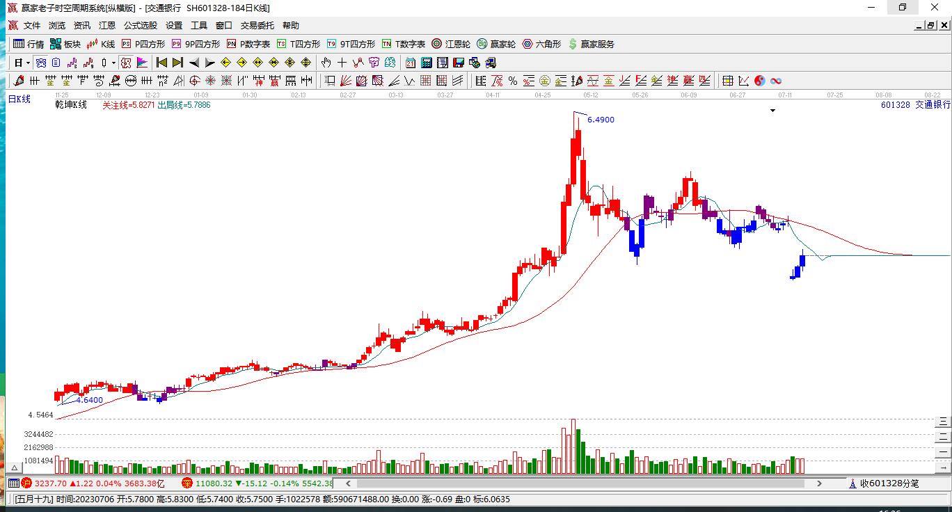 601328交通銀行處于贏家江恩多頭中期回調(diào)形態(tài),從11月26日形成頂分型后持續(xù)下跌,重心下移,今日跌破前低形成短期初次筑頂信號,短期多頭趨勢已被破壞,中長線均在空頭下跌趨勢中。601328交通銀行根