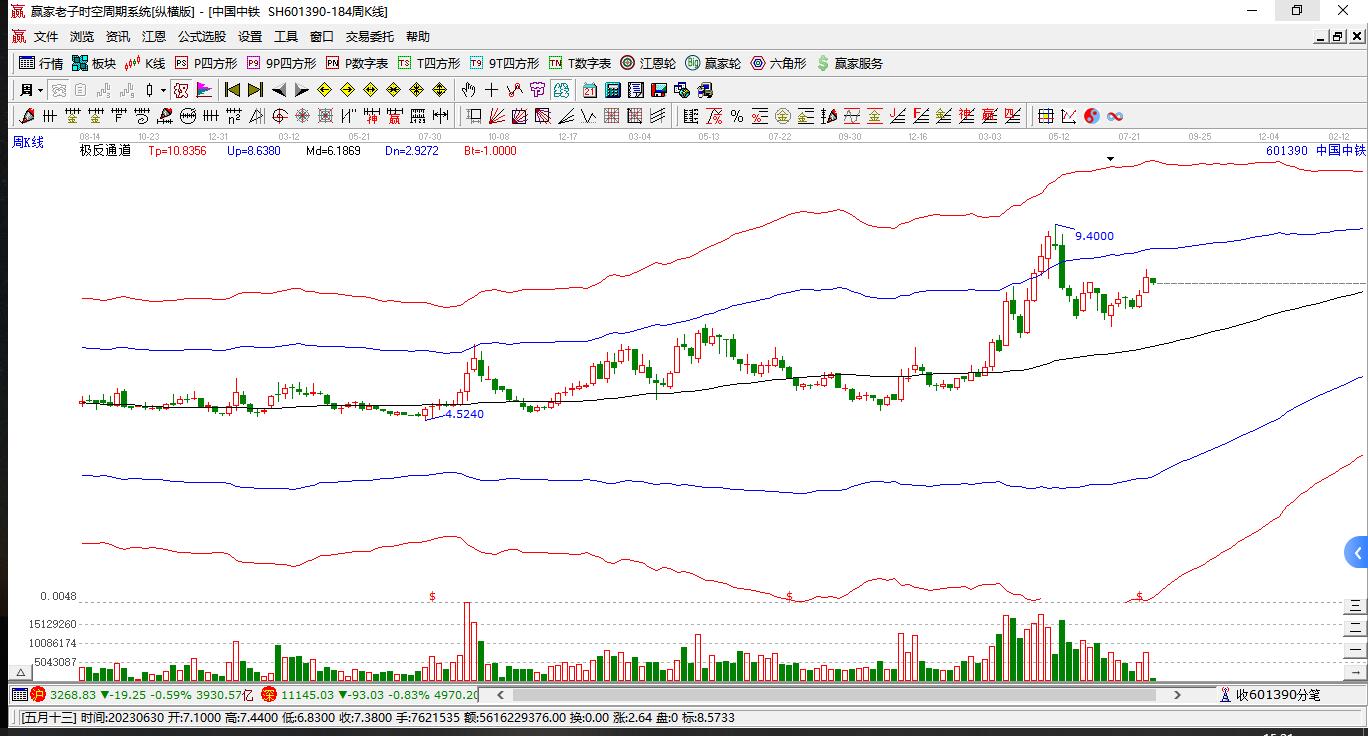 當天601390中國中鐵挑戰(zhàn)藍色外軌線 以上影中陽線收盤