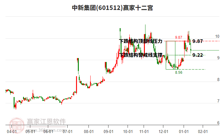 2月13日股價處在2026年1月30日形成的上漲結(jié)構(gòu)底部線與警戒線之間,今日股價微跌0.94%,目前處于底部線上方。依據(jù)贏家十二宮多空能量守恒規(guī)則,上漲結(jié)構(gòu)底部線位置是多空能量轉(zhuǎn)換的一個關(guān)鍵位置。如底部線9.31支撐不破,由多方能量主導(dǎo)上攻,在警戒線9.67尋找多空能量平衡。如跌破底部線,空方動能占據(jù)主導(dǎo),打開新的下跌空間。