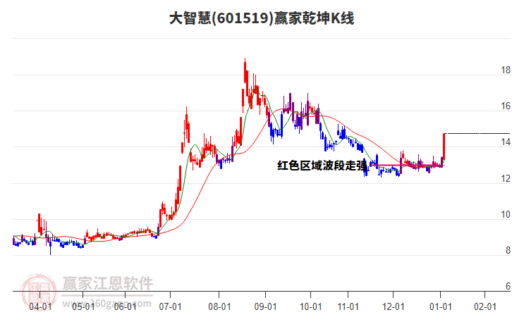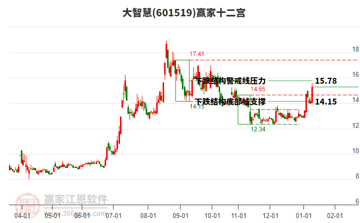 大智慧(601519)低開收穿頭破腳大陽線,受贏家十二宮下跌結構警戒線壓制
