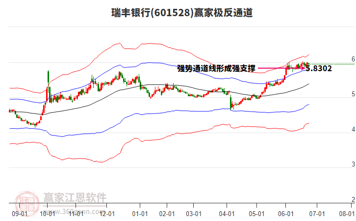 依據(jù)贏家江恩系統(tǒng)趨勢工具極反通道分析判斷瑞豐銀行601528運(yùn)行在生命線以下弱勢區(qū)域,根據(jù)規(guī)則該股短線輕倉參與,股價(jià)跌至弱勢外軌線后波段再結(jié)合其它工具信號建倉。應(yīng)用口訣是:生命線上強(qiáng)勢走,生命線下難抬頭;紅黃兩條外軌線,壓力支撐顯勢頭。