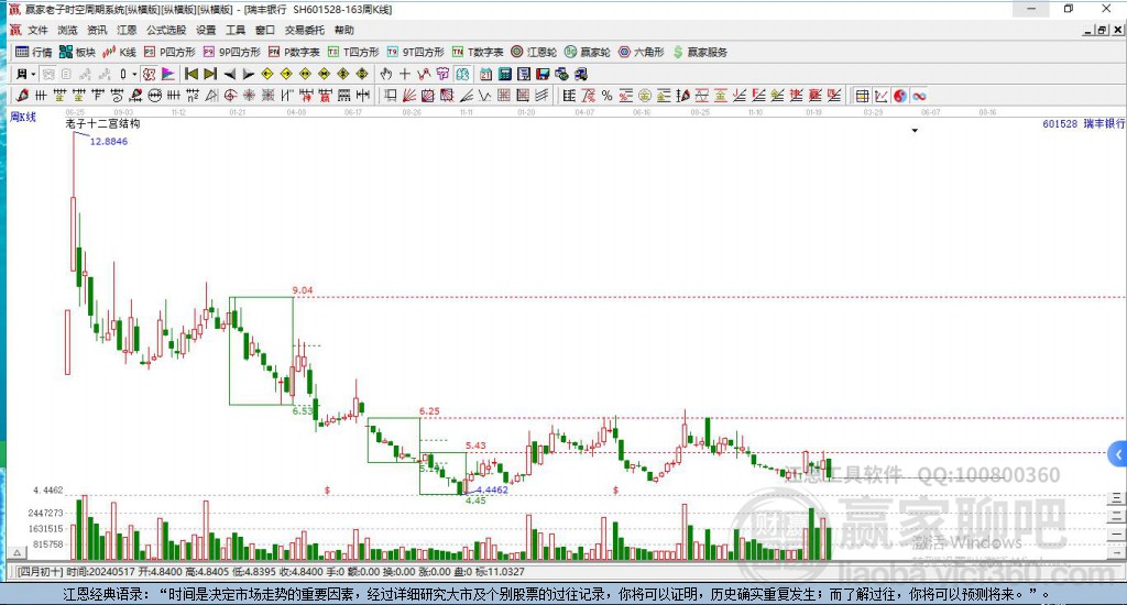 601528瑞豐銀行處于贏家江恩多頭次主線形態(tài),12月26日發(fā)出江恩筑底信號后,經(jīng)過32日,今日形成短期筑頂信號,短期多頭趨勢已被破壞,中期雖然處于回調(diào)中,但長期多頭趨勢延續(xù)。瑞豐銀行目前K線為穿頭破