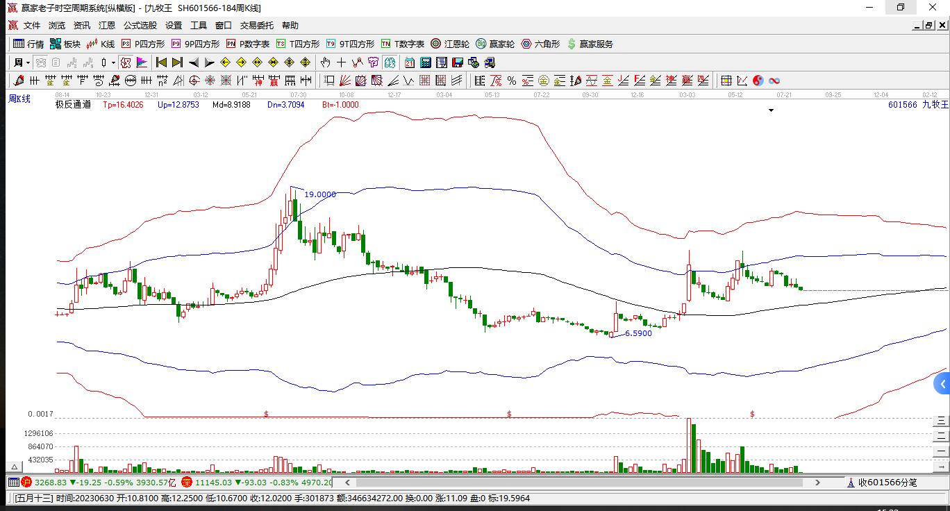 依據贏家江恩極反通道趨勢工具展示,本周股價處于生命線上強勢通道,本周收盤價11.5,自近期通道內高點18.68持續(xù)下跌至本周,到達生命線9.8471點上方,短期關注此線支撐,如支撐不破,保持在強勢通道內,波段繼續(xù)看多,有望再次挑戰(zhàn)藍色上軌線。若跌破生命線9.8471,進入弱勢通道,打開下跌空間。