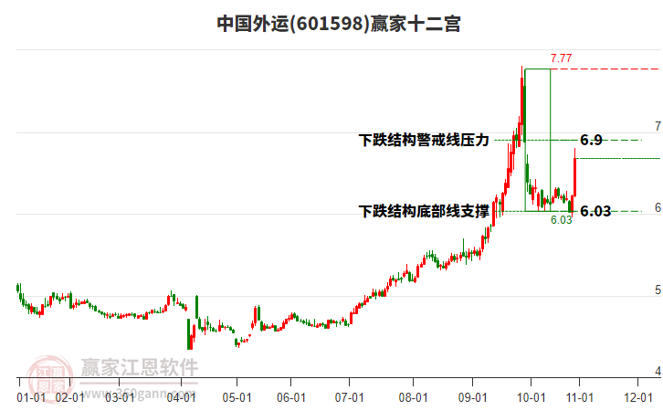601598中國(guó)外運(yùn)處于贏家江恩多頭中期回調(diào)形態(tài),11月28日發(fā)出江恩筑頂信號(hào)后,經(jīng)過(guò)13日,今日再次發(fā)出江恩底分型并發(fā)出江恩筑底信號(hào),中長(zhǎng)線均在空頭下跌趨勢(shì)中。中國(guó)外運(yùn)今日雖高開,但現(xiàn)在K線為下影小